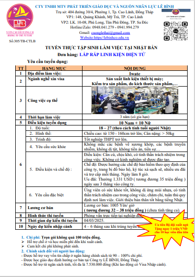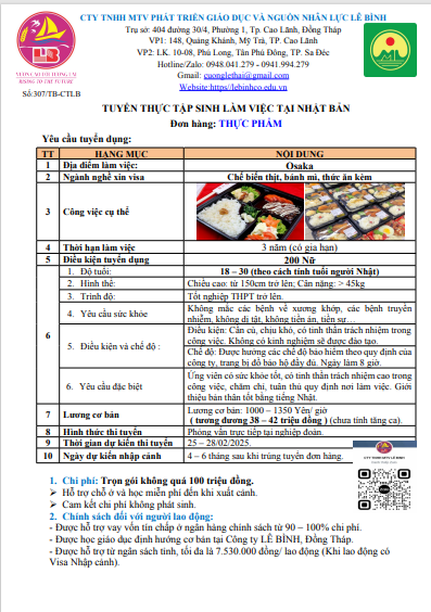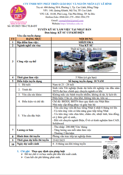 Công ty Lê Bình đang tuyển dụng các kỹ sư và các thực tập sinh làm việc tại các tỉnh ở Nhật Bản với mức lương cao. Các đơn hàng được phỏng vấn và tháng 2; 3 năm 2025.