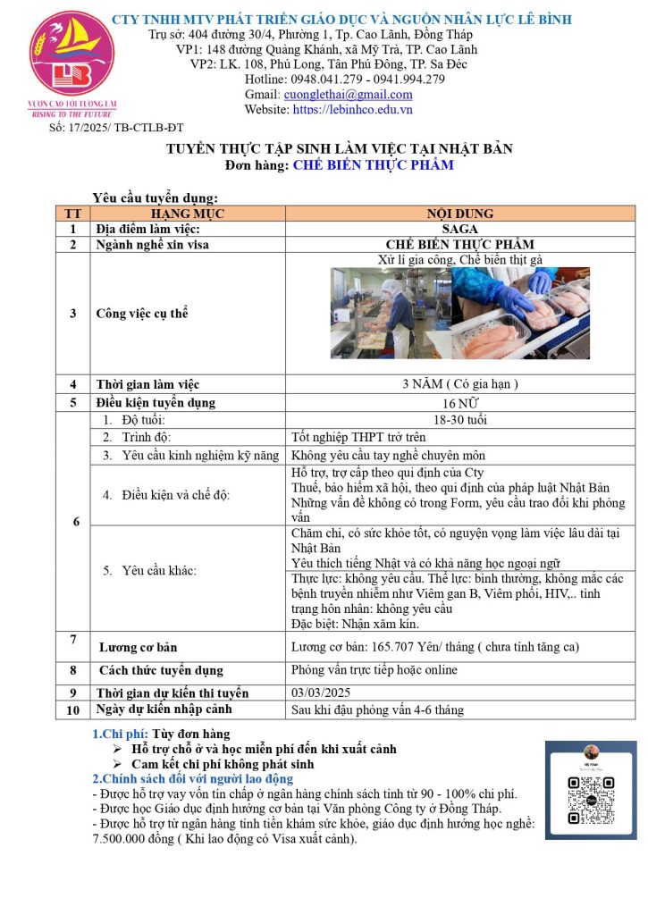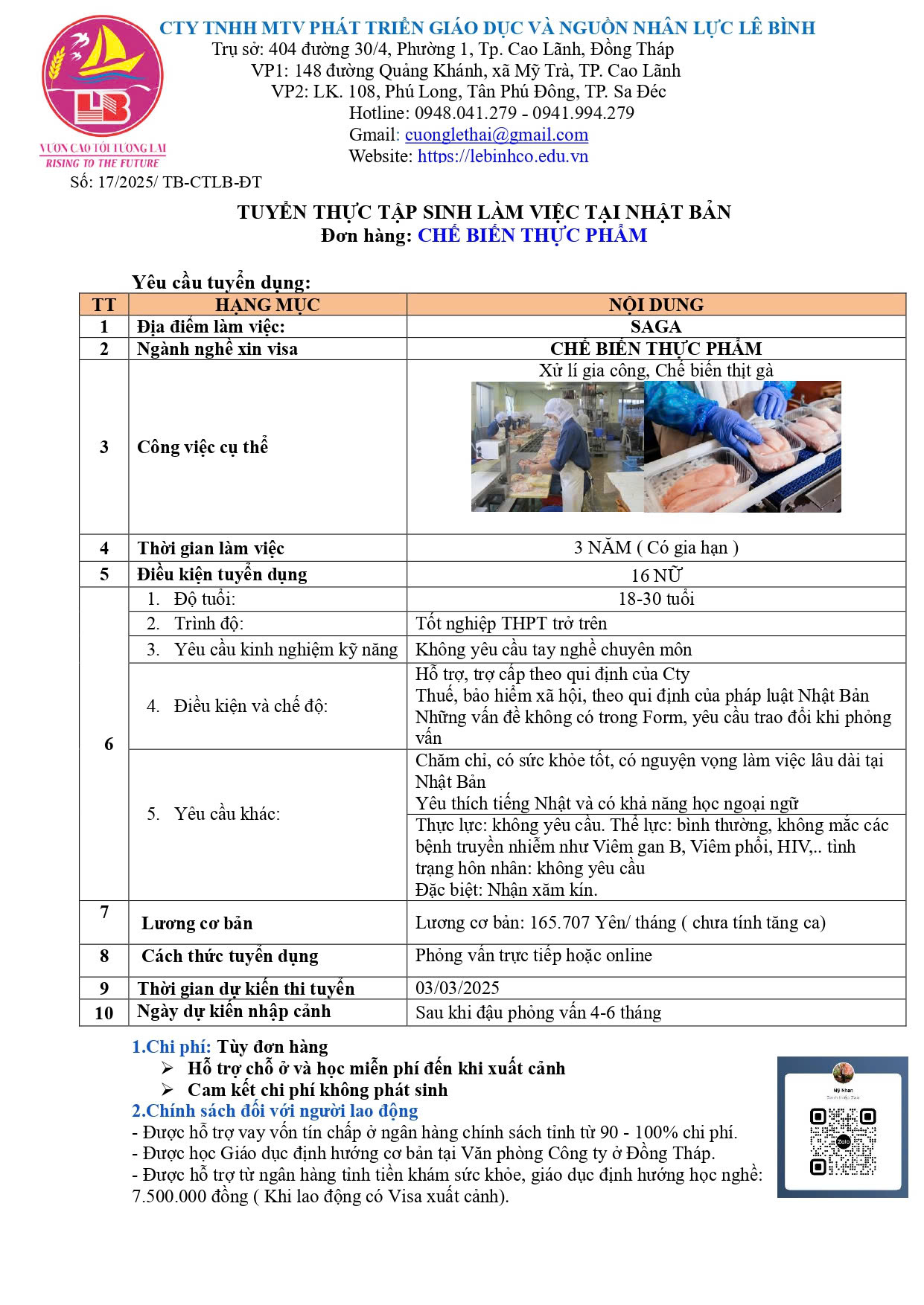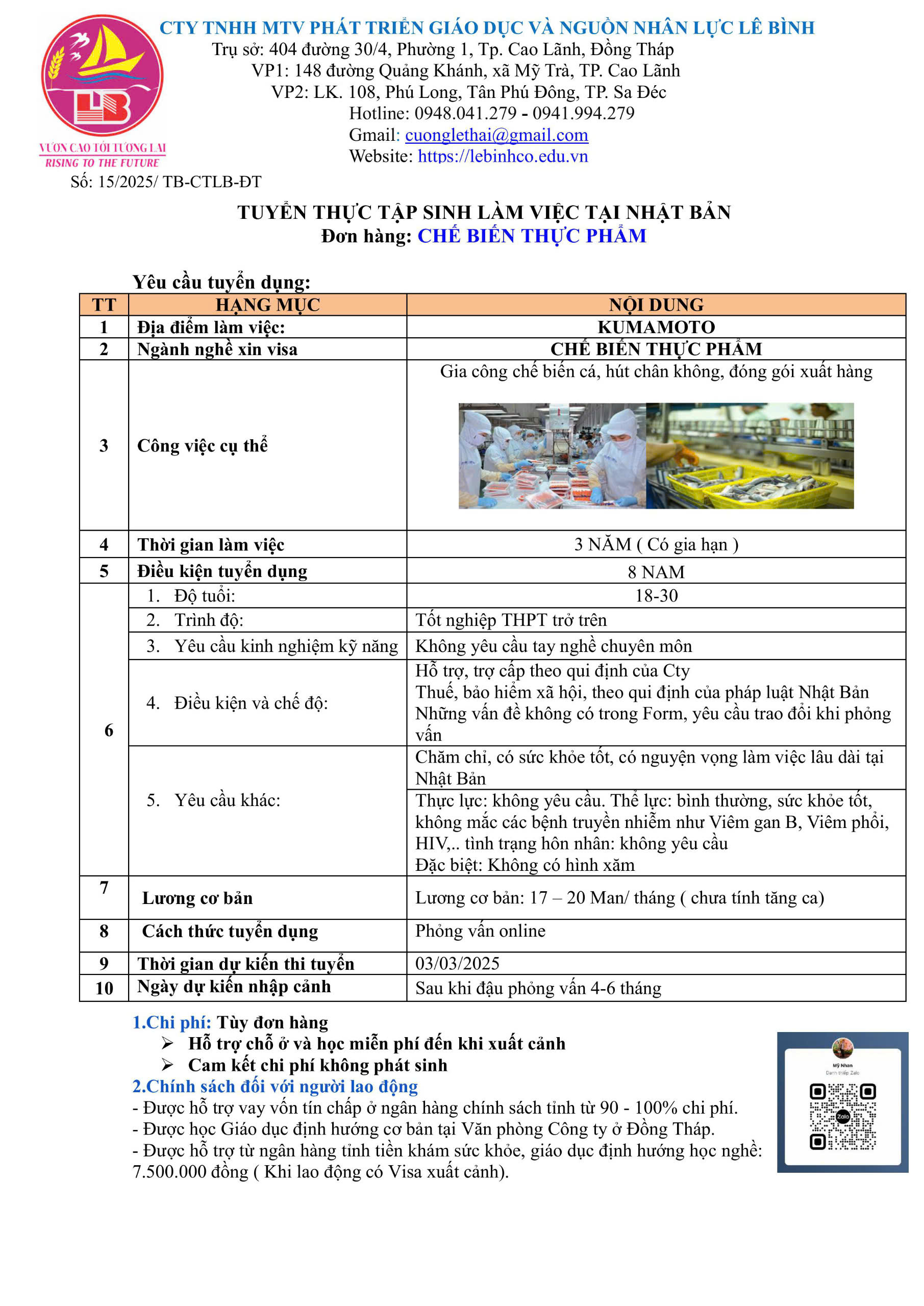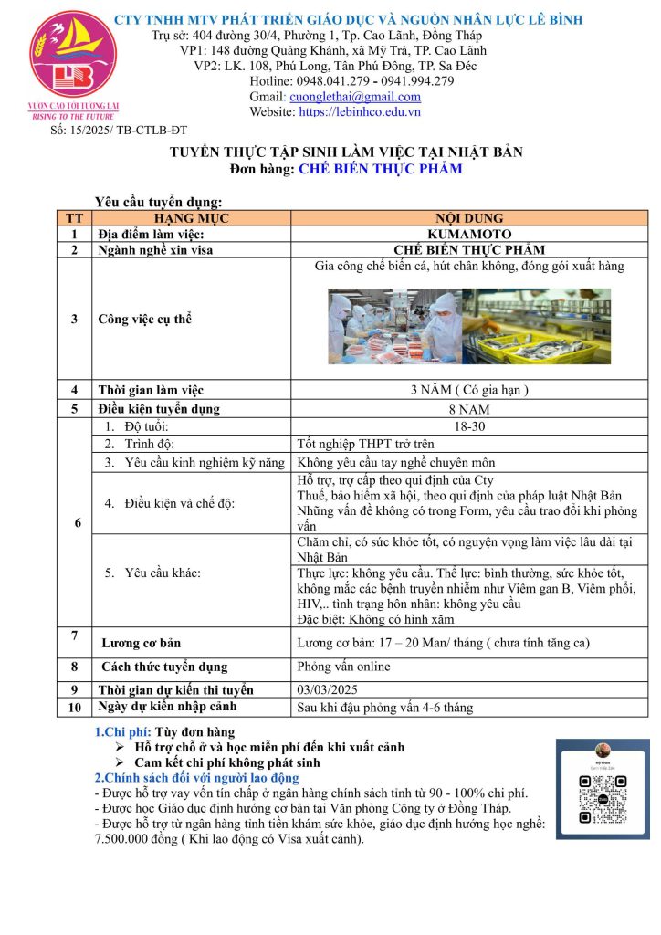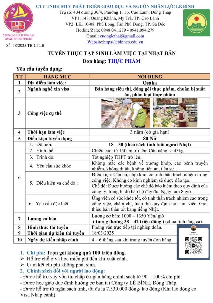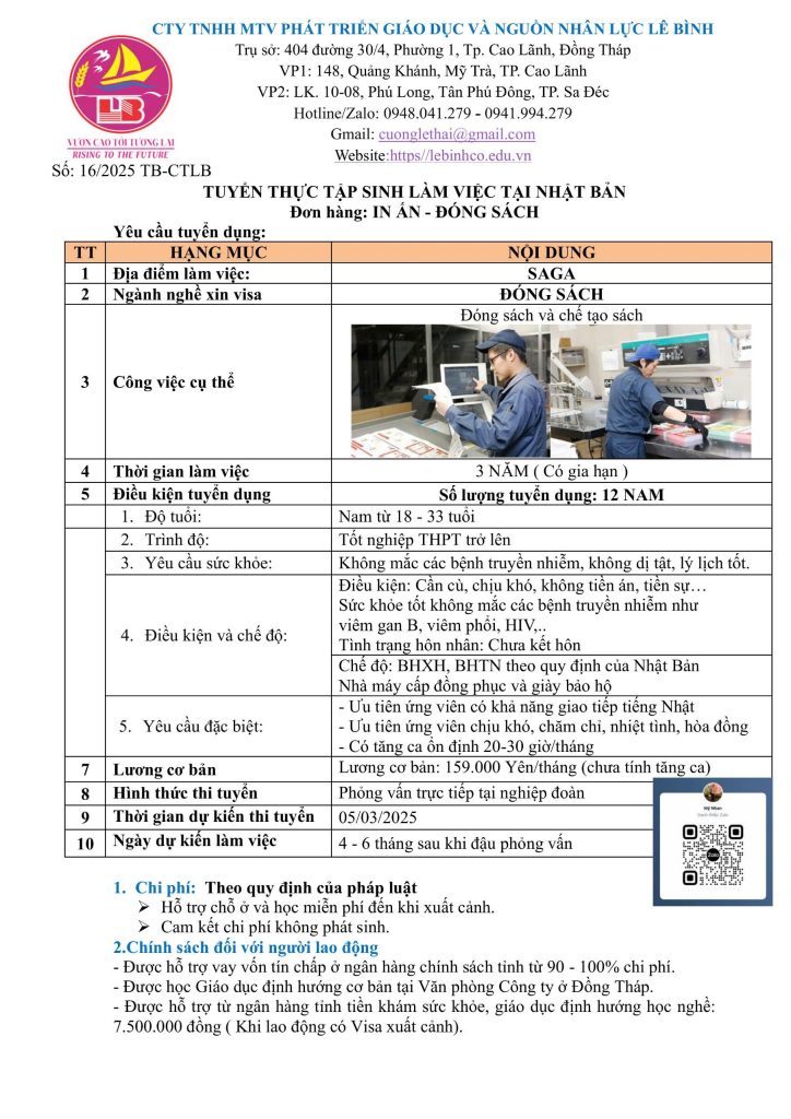 Cty Lê Bình đang có các đơn hàng tốt làm việc tại Nhật với mức lương cực kì hấp dẫn dự kiến phỏng vấn vào tháng 3.