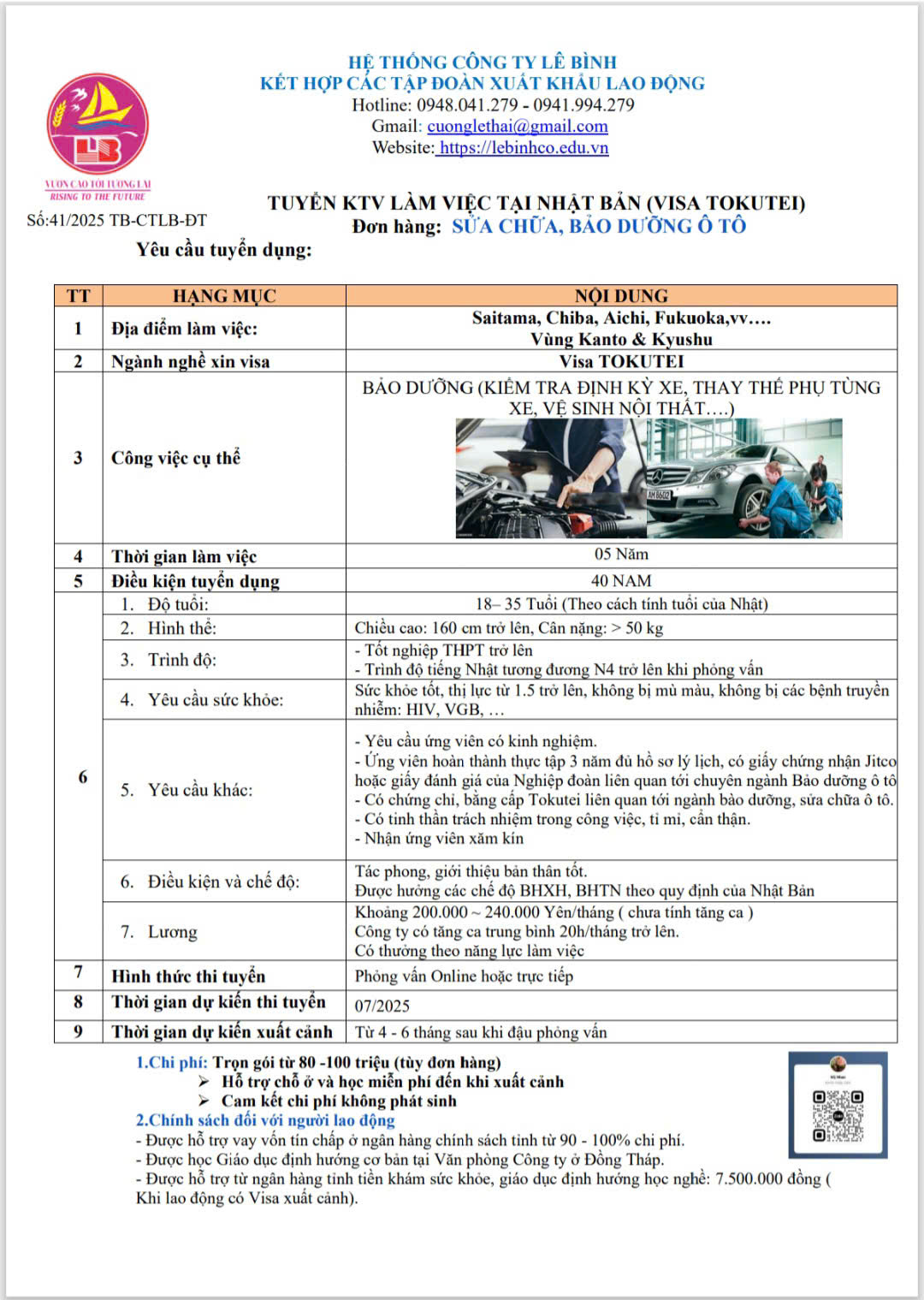 Cơ Hội Vàng Làm KTV Sửa Chữa Ô Tô Tại Nhật Bản (Visa Tokutei): Lương 200.000-240.000 Yên/Tháng (~34 – 41 Triệu VND), Xuất Cảnh 4-6 Tháng, Cam Kết Không Phí Phát Sinh!