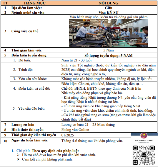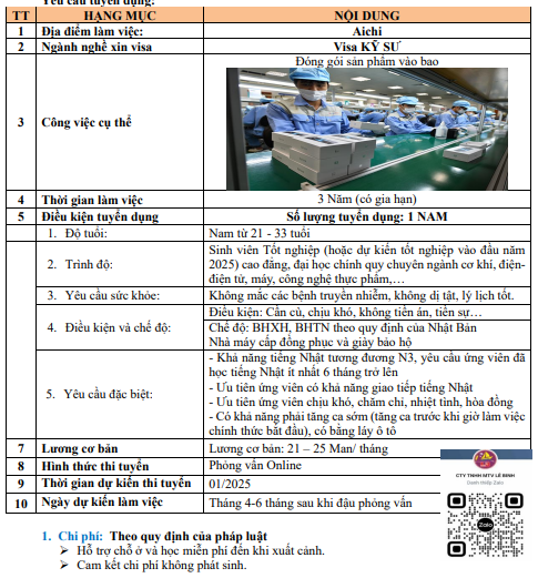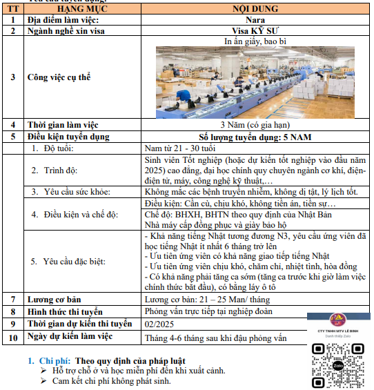 Thông báo tuyển lao động làm việc tại Nhật Bản, các đơn hàng: Vận hành máy, Đóng gói bao bì, In ấn. VISA Kỹ sư