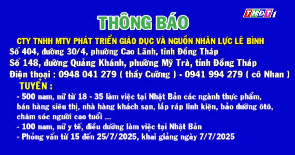 Việc Công ty TNHH MTV Phát triển Giáo dục và Nguồn Nhân lực Lê Bình xuất hiện trên sóng Đài Truyền hình Đồng Tháp là minh chứng rõ ràng cho uy tín và chất lượng dịch vụ mà công ty đã xây dựng. Sự công nhận từ một kênh truyền thông chính thống của tỉnh không chỉ khẳng định sự minh bạch, chuyên nghiệp mà còn tạo niềm tin vững chắc cho các học viên và gia đình trong hành trình xuất khẩu lao động và giáo dục nghề.