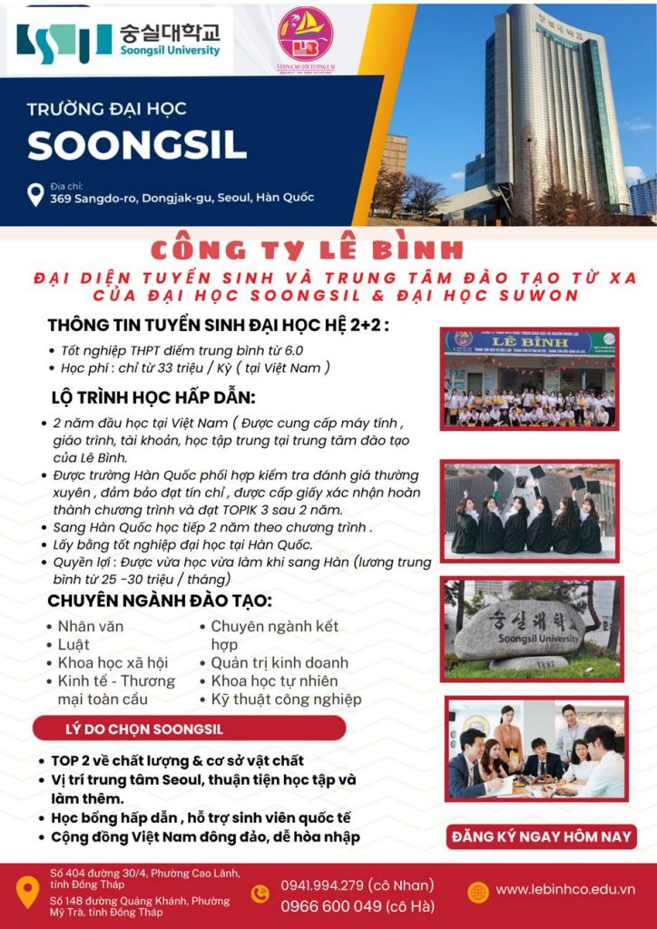 Nếu bạn đang tìm một trường top, học phí hợp lý, visa thẳng, môi trường hỗ trợ tốt thì Soongsil chính là lựa chọn bạn không thể bỏ qua.Hãy liên hệ Lê Bình ngay nào !!!