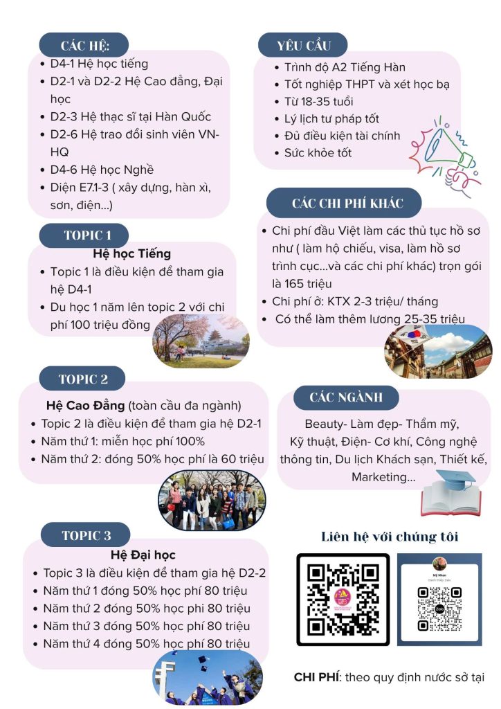 - Kết nối với hơn 100 trường đại học danh tiếng tại Hàn Quốc, từ Seoul đến Daegu, với học phí thấp nhất từ 3.600.000 KRW/năm.