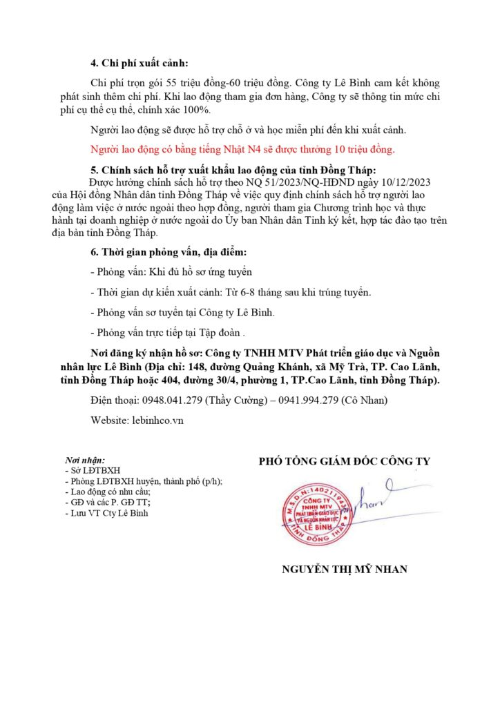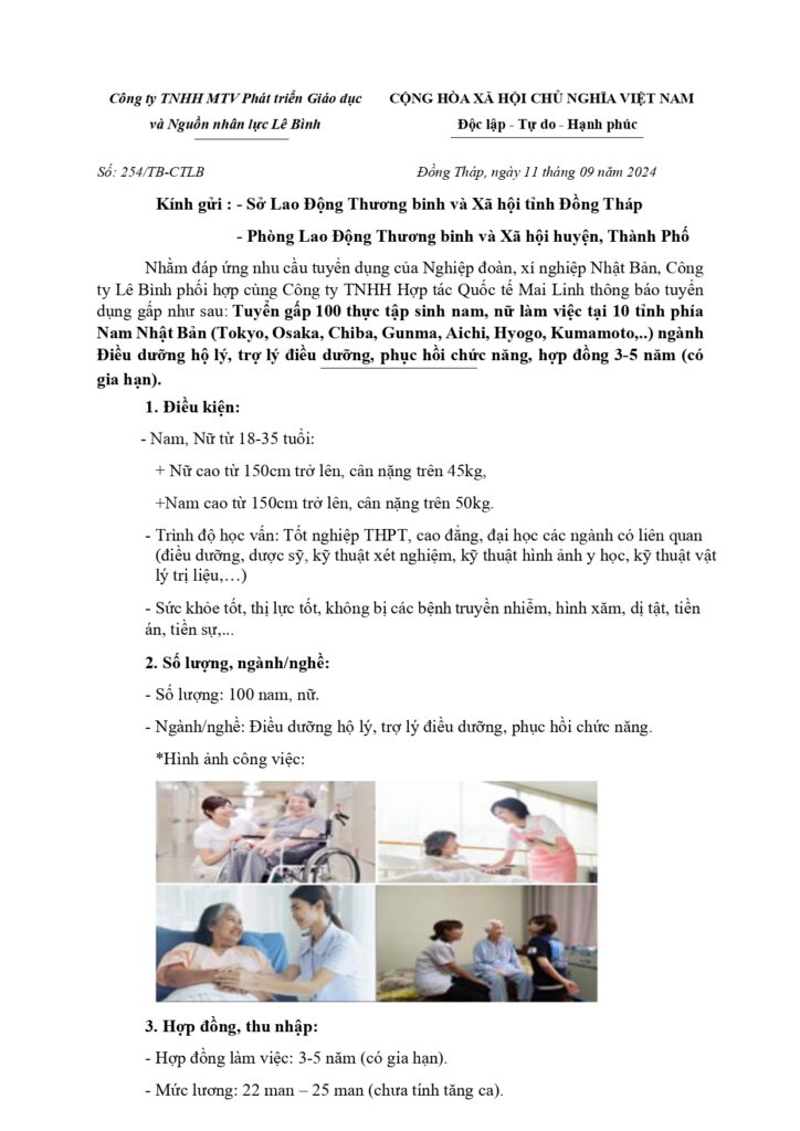 NHANH TAY ỨNG TUYỂN THAM GIA CHƯƠNG TRÌNH THỰC TẬP SINH NGÀNH ĐIỀU DƯỠNG LÀM VIỆC TẠI NHẬT BẢN + Chi phí đơn hàng trọn gói: 55-60 triệu đồng + Học Ngoại ngữ tại Đồng Tháp + Hỗ trợ vay vốn lên đến 100% chi phí đơn hàng + Được nhận trợ cấp của tỉnh Đồng Tháp 7.530.000 đ Công ty TNHH MTV Phát Triển Giáo dục và Nguồn nhân lực Lê Bình Số 404, đường 30/4, Phường 1, Tp Cao Lãnh, ĐT Số 148, đường Quảng Khánh, Mỹ Trà, Tp Cao Lãnh, ĐT Liên hệ: 0948041279 – 0941994279 – 0763907044 (gặp Sin, cán bộ tư vấn tuyển sinh)