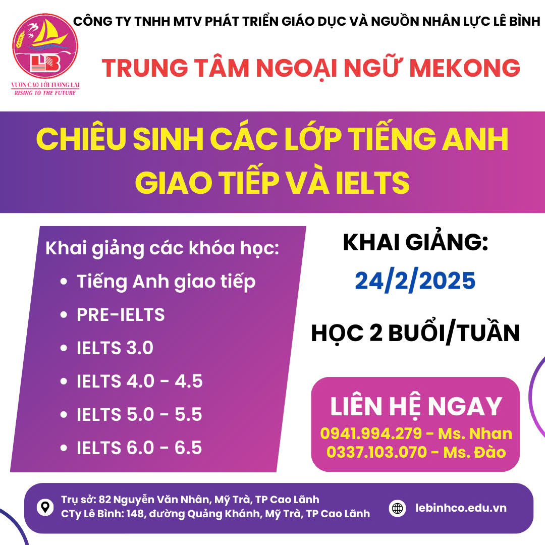 Trung tâm Ngoại ngữ Mekong với đội ngũ giảng viên, giáo viên nhiệt tình, nhiều kinh nghiệm. Môi trường học tập hiện đại, giáo trình bám sát đề thi nhằm giúp học viên đạt được mục tiêu theo lộ trình cụ thể.