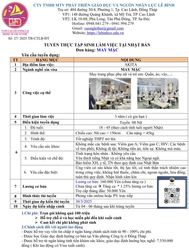 Cty Lê Bình đang cần tuyển 08 Thực tập sinh nữ cho đơn hàng may mặc làm việc tại Nhật Bản. Lịch phỏng vấn dự kiến: 30/03/2025.