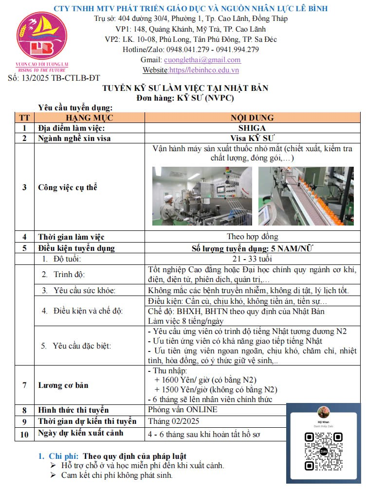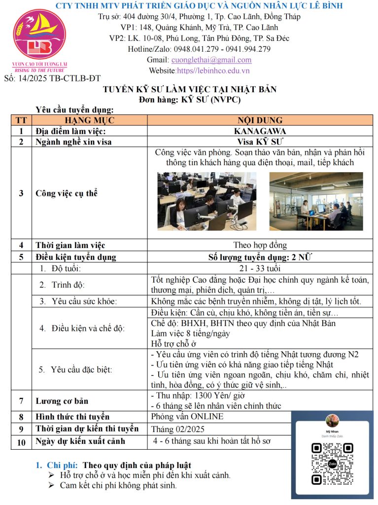 Công ty Lê Bình đang tuyển kĩ sư cho 2 đơn hàng làm việc tại Nhật Bản dự kiến phỏng vấn vào tháng 2/2025.